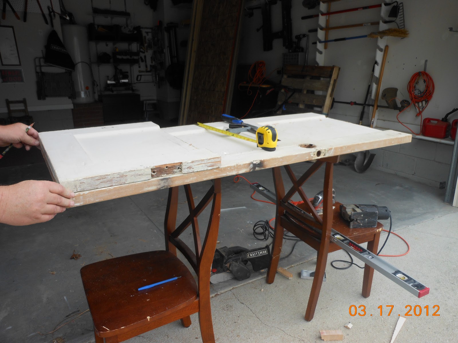 Then we measured the door, trying to decide the height and width. Hubby cut my now very stinky door into 3 pieces, two sides and the top.